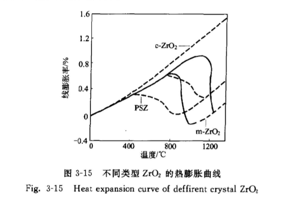 還有一種情況是,因為材料形狀或傳熱特性使其中的溫度分布不均勻(即產生溫度梯度)時產生的應力。熱膨脹行為是影響材料抗熱震極其重要的因素,根據熱膨脹理論可對材料的熱膨脹行為進行設計和調整,特別是對氧化鋯的熱膨脹系數的大小和穩定劑的種類和添加量有一定的關系。這對考察它的抗熱震性有重要的意義。圖3-15[13]給出了純單斜、部分穩定及立方氧化鋯的熱膨脹曲線。