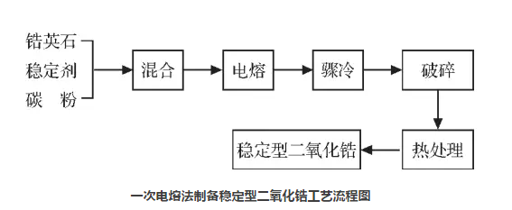 二次電熔法是將鋯英石與碳粉按比例混勻后,經電弧爐電熔脫硅處理,驟冷,再經破碎制成單斜二氧化鋯。再將單斜二氧化鋯根據需要按比例配入某種穩定劑,混合均勻后進行第 2次電熔,電熔好后驟冷,再經破碎、熱處理后便可制成穩定的二氧化鋯。此方法制得的穩定二氧化鋯雜質含量低,致密度高。工藝路線如圖。