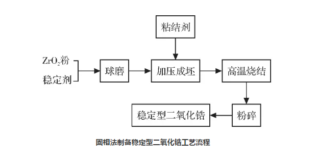 固相法又稱為燒結法,通常是將二氧化鋯原料和穩定劑按一定的配比在橡膠襯里和鋯球的球磨機中共同濕粉碎到粒徑小于2μm,然后經分離、干燥、打粉制成團塊,并在1700 ℃下進行高溫固相反應, 將高溫燒結塊粉碎至所需粒度即得穩定型二氧化鋯。此方法制得的穩定型 ZrO2 粒度分布廣,易混入不純的雜質。工藝路線如圖。
