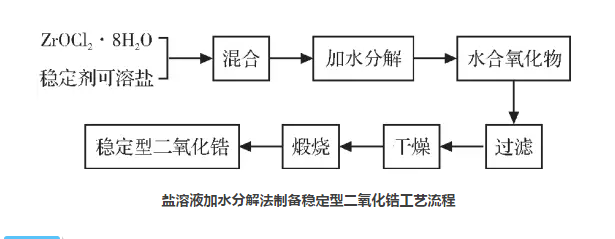 加水分解法的優點是不需要添加堿就可使鋯鹽和穩定劑可溶鹽的混合溶液水解,因而無有害陰離子和堿金屬離子。其又可分為鹽溶液加水分解法和烷氧化合物加水分解法。鹽溶液加水分解法是將鋯鹽與穩定劑可溶鹽的混合溶液,通過加熱進行加水分解反應,干燥煅燒所生成的膠體制得穩定性二氧化鋯工業陶瓷棒。這種方法操作簡便,但能耗高, 生成的粉體易團聚。工藝流程如圖。