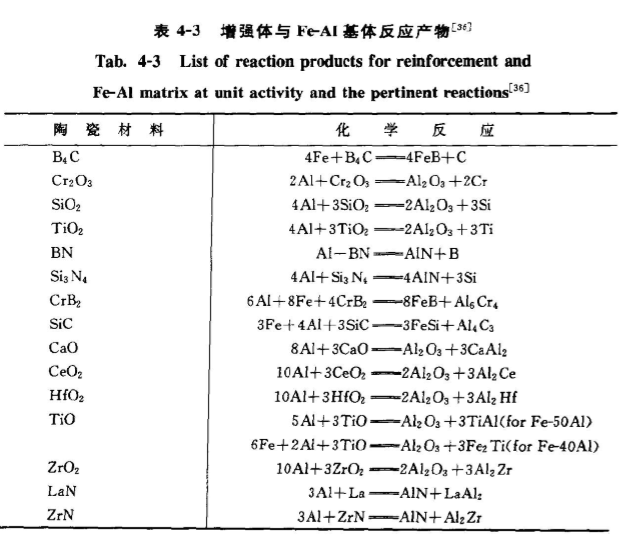 由表4-2可以看出,F(xiàn)eAI與A2O具有較好的適配性能,兩者之間無(wú)界面相形成。AAYK. MISRAZ在1990年也分析預(yù)測(cè)了以FeAl金屬間化合物為基體,陶瓷為增強(qiáng)體復(fù)合村料的熱動(dòng)力學(xué)可能反應(yīng)產(chǎn)物),分析結(jié)果見表4-3。上述結(jié)果對(duì)復(fù)合材料的設(shè)計(jì)也是非常重要的。