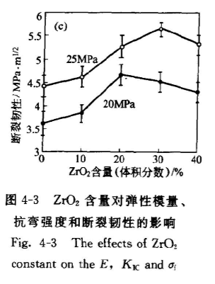 如圖4-3所示,壓力較低時(shí),斷裂強(qiáng)度隨ZrO2含量的增加而增加,與其密度的變化趨勢(shì)相一致,這說(shuō)明此時(shí)影響斷裂強(qiáng)度的主要因素是材料的度。壓力為25MPa且降溫保壓所制得材料的斷裂強(qiáng)度存在一個(gè)大值,之后隨ZrO2含量的增加反而降低,據(jù)此推斷,此時(shí)對(duì)斷裂強(qiáng)度產(chǎn)生損害的是Al2O3/cZrO2之間熱膨脹差引起的拉應(yīng)力及微裂紋。