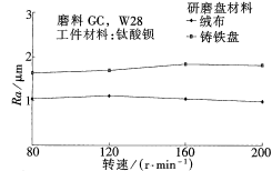 從實驗結果(見圖3)來看,磨盤材料對加工表面粗糙度有明顯的影響。使用絨布時,由于絨布的彈性拋光作用,表面粗糙度明顯低于使用鑄鐵盤。隨著轉速的提高,表面粗糙度下降。