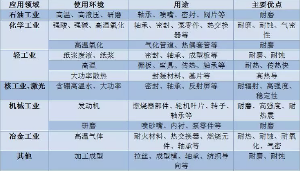碳化硅以共價鍵為主,共價鍵約占88%。晶格的基本結構是互相穿插的SiC4和CSi4四面體。SiC具有α和β2種晶型,當溫度低于1600℃時,SiC以β-SiC形式存在,當高于1600℃時,β-SiC轉變?yōu)?amp;alpha;-SiC形式。碳化硅陶瓷在現(xiàn)代的工業(yè)中碳化硅起著不可或缺的作用。表1詳細地列出了其用途。